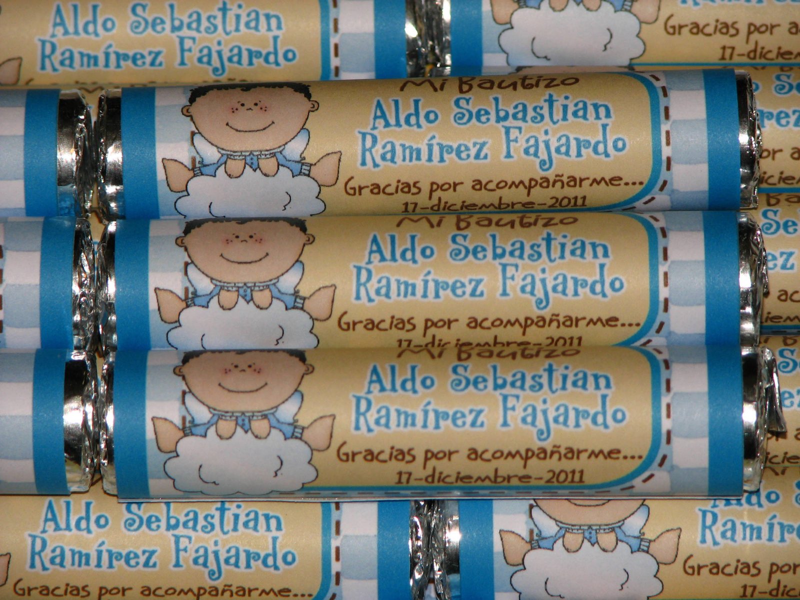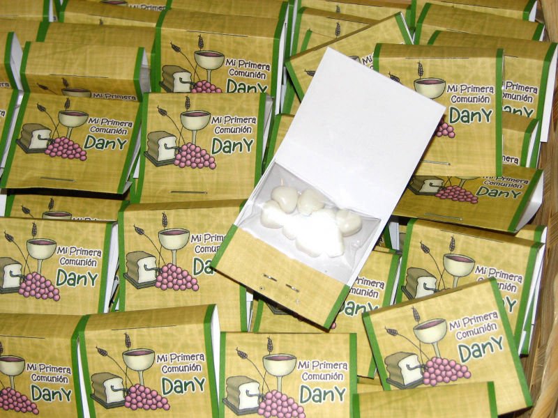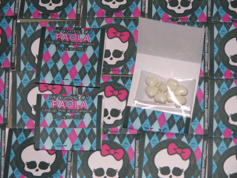 Aprox. 10 mentitas en forma de corazón en sobresito personalizado con imágenes y datos de tu evento.